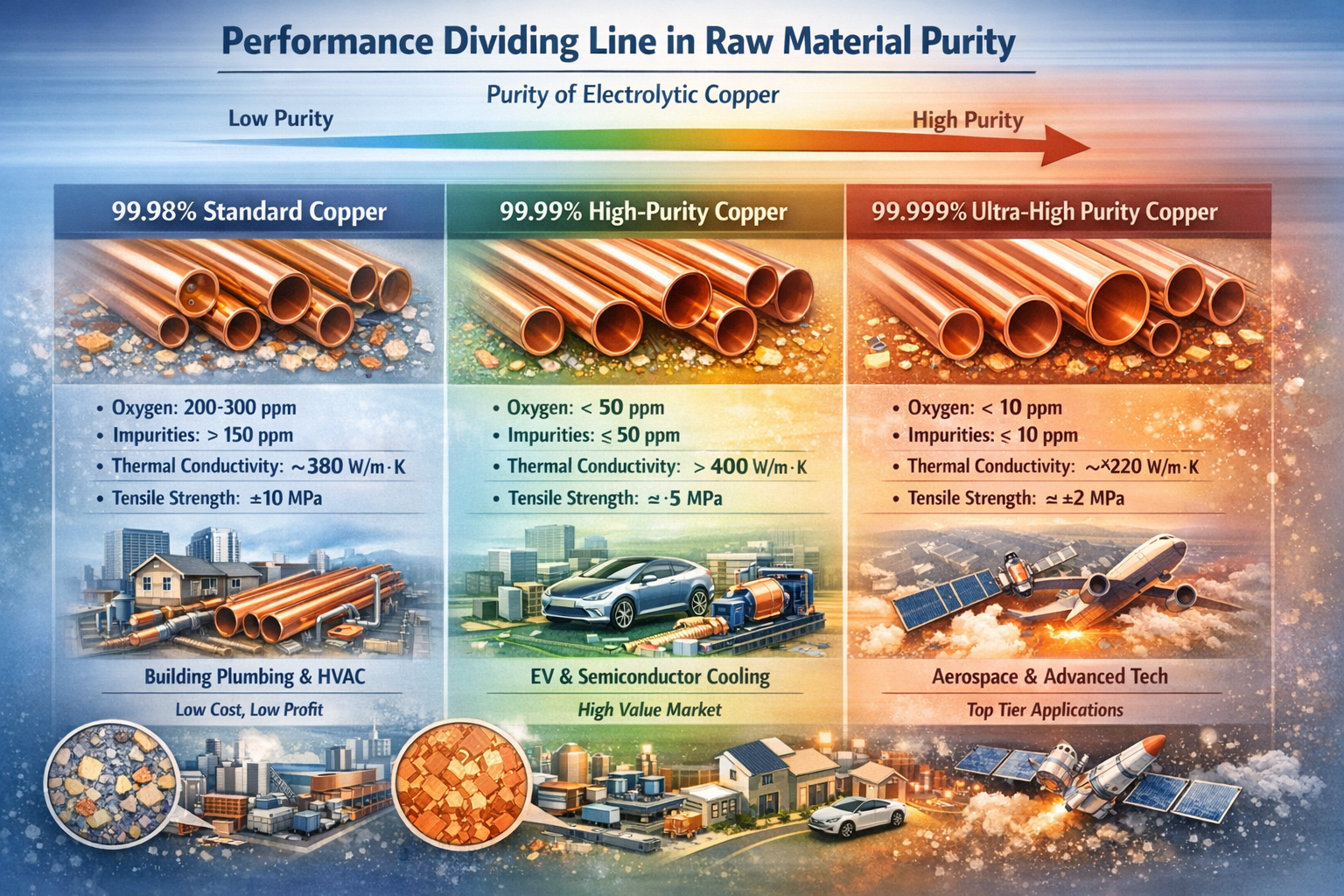 | Niveau de pureté des matières premières | Teneur en impuretés de base (ppm) | Performances des tubes en cuivre après traitement | Scénarios applicables | Coût d'approvisionnement en matières premières (RMB/tonne) | Bénéfice du produit par tonne (RMB) | Taux de défauts du produit |