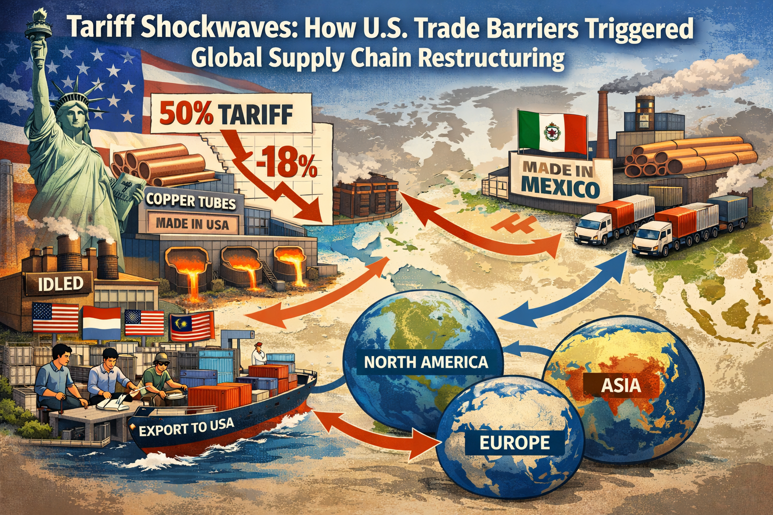 Sous-titre : Lorsque les États-Unis ont imposé des droits de douane de 50 % sur les tubes en cuivre, déclenchant une restructuration de la chaîne commerciale mondiale, comment la capacité de production en Asie du Sud-Est et au Mexique a-t-elle augmenté de 46,3 % en un an ? Cette migration de la chaîne d’approvisionnement motivée par des politiques redessine la carte mondiale de répartition de la valeur des tubes en cuivre.