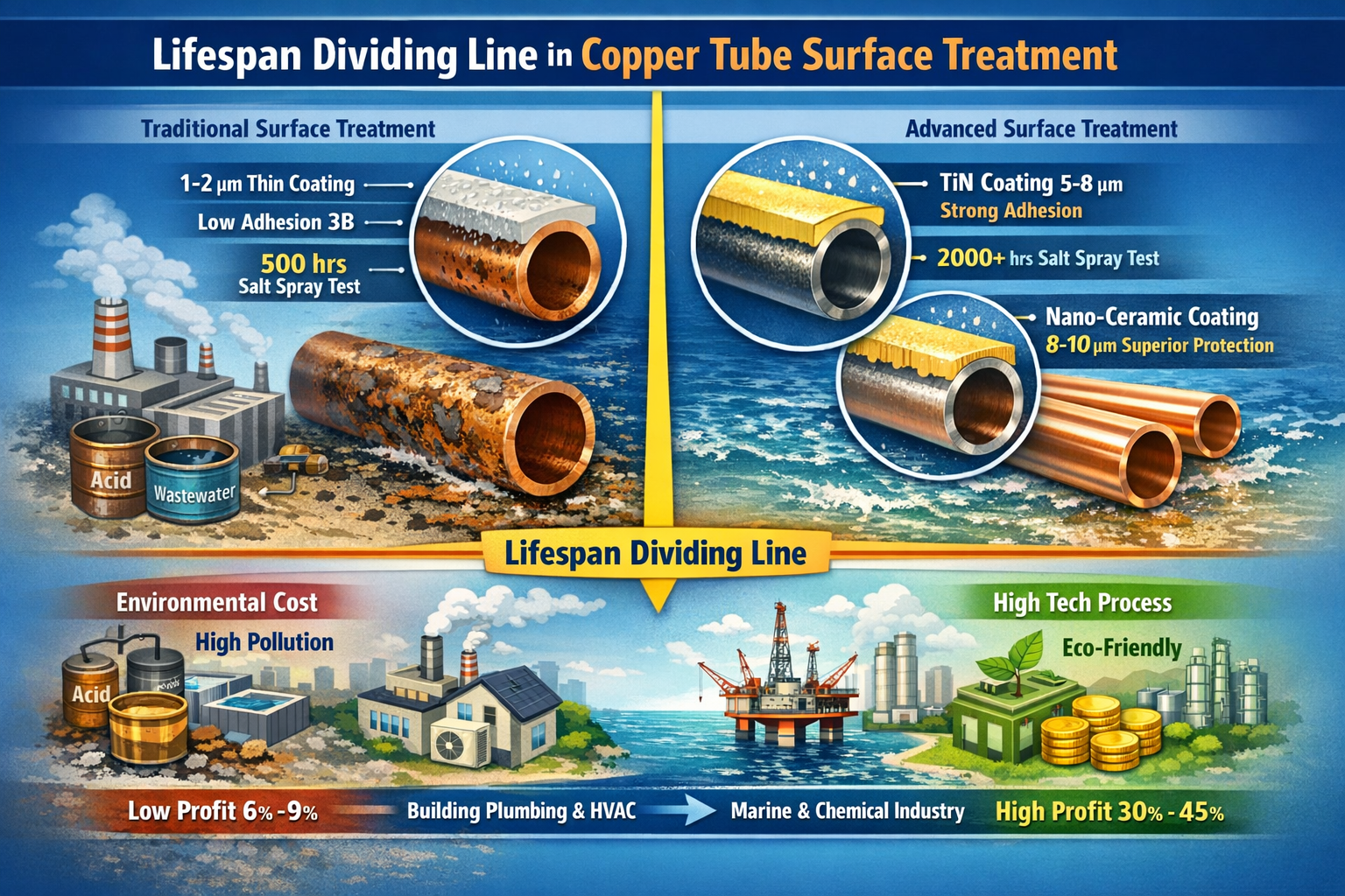 « Les deux sont tubes de cuivre utilisé dans équipement de dessalement d'eau de mer , mais les produits que nous avons traités avec décapage et passivation conventionnels a montré une corrosion par piqûres et des fuites en moins de 3 ans dans le milieu marin ; tetis que le produit du concurrent, traité avec technologie de placage ionique sous vide , a une durée de vie de plus de 15 ans et son prix unitaire est 30 % plus élevé que le nôtre. M. Liu, directeur technique d'une entreprise de tubes en alliage de cuivre à Qingdao, a montré deux sections de tubes en cuivre mis au rebut et intacts, révélant la valeur cachée de la technologie de traitement de surface. Le traitement de surface, en tant qu'étape finale de la production de tubes en cuivre, peut sembler être une simple opération auxiliaire de « dérouillage et revêtement », mais il détermine directement la qualité du produit. résistance à la corrosion, résistance à l'usure , et durée de vie , et further impacts its market positioning and added value. Currently, most domestic copper tube manufacturers still rely on traditional surface treatment processes such as décapage et passivation ordinaire , rendant leurs produits inadaptés aux environnements exigeants tels que traitement de l'eau marine, chimique et haut de gamme ; quelques entreprises ont toutefois amélioré leur technologies de traitement de surface raffinées , permettant à leurs tubes en cuivre de maintenir des performances stables dans des environnements extrêmes et de conquérir facilement le marché haut de gamme. Ce mince " film protecteur " est en train de devenir un détail essentiel qui différencie la compétitivité des produits en tubes de cuivre, et il détient également la clé de la mise à niveau de l'industrie de " qualifié " à " de haute qualité ".