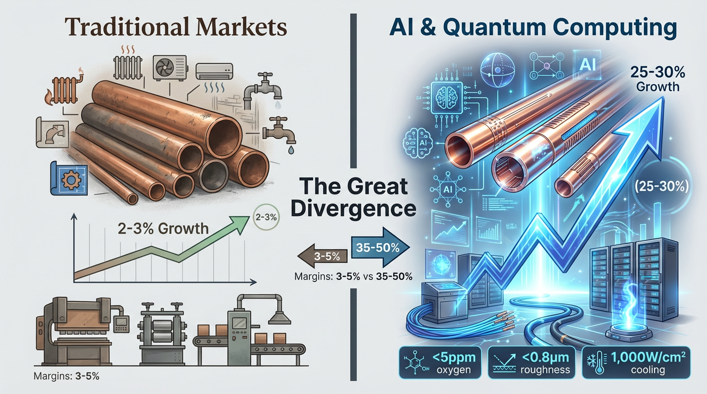 Le mondial tube de cuivre l’industrie connaît une fragmentation sans précédent. Tandis que construction traditionnelle and Applications CVC croître à un rythme modeste de 2 à 3 % par an, la demande de tubes de précision dans la fabrication de semi-conducteurs, l’infrastructure d’IA et l’informatique quantique, augmente de 25 à 30 % par an. Cette divergence crée un marché à deux vitesses : les producteurs de vrac peinent à réaliser des marges de 3 à 5 %, tandis que les fabricants spécialisés réalisent des marges brutes de 35 à 50 % pour les tubes répondant à des spécifications extrêmes.