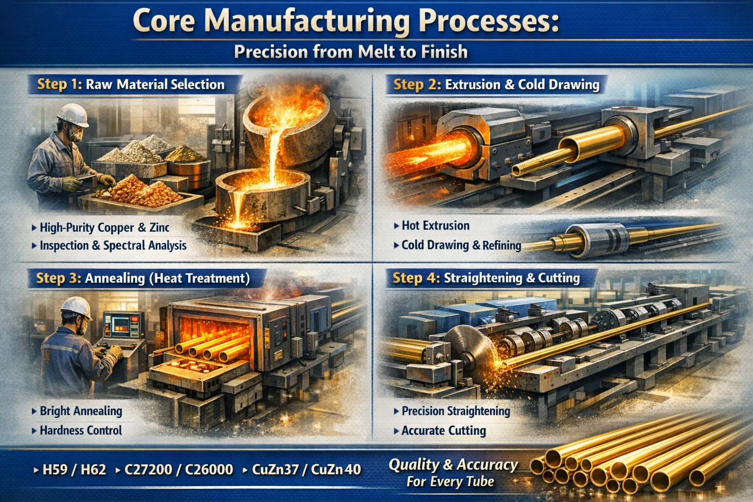 La transparence est le fondement de la confiance dans les partenariats B2B. Une usine professionnelle de tubes en laiton ne se contente pas de « fabriquer » des tubes ; il suit une séquence rigoureuse et contrôlée scientifiquement pour garantir que chaque millimètre du produit répond aux normes internationales.