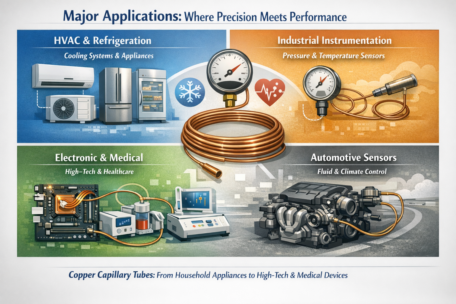 L'utilisation la plus courante des tubes capillaires en cuivre est dans l'industrie du CVC (chauffage, ventilation et climatisation). Il agit comme principal appareil de mesure dans les systèmes de refroidissement à petite et moyenne échelle.