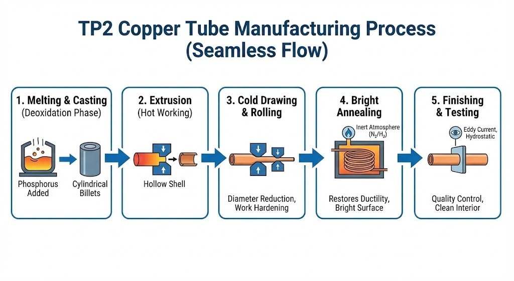 La production de tubes en cuivre TP2 est un voyage allant de la fusion à haute température au travail à froid de haute précision. La plupart des tubes TP2 haut de gamme sont produits sous forme tubes sans soudure , ce qui élimine le risque de rupture des cordons de soudure.