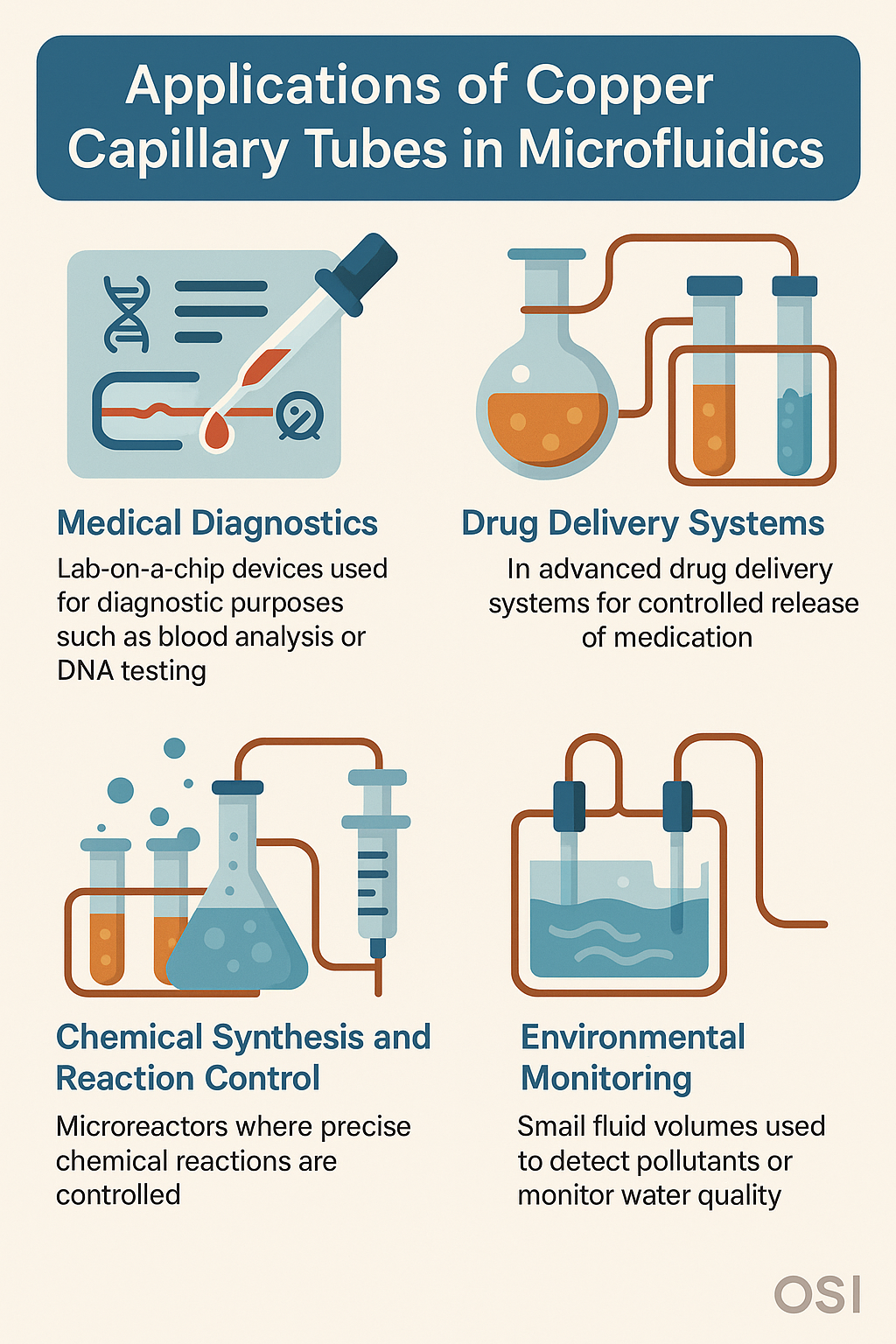 La polyvalence de tubes capillaires en cuivre leur permet d'être utilisés dans une variété d'applications microfluidiques. Certains des domaines les plus importants dans lesquels ces tubes sont utilisés comprennent :